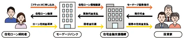 住宅金融支援機構は、モーゲージバンクから買い取った住宅ローン債権を裏付けに証券を発行(証券化)して投資家に販売し、その発行代金を住宅ローン債権の買取代金としてモーゲージバンクに支払います。